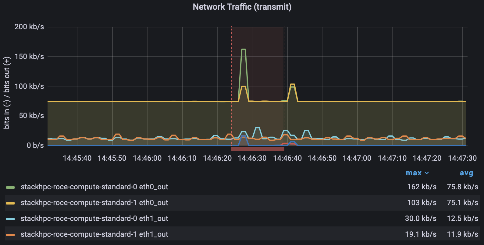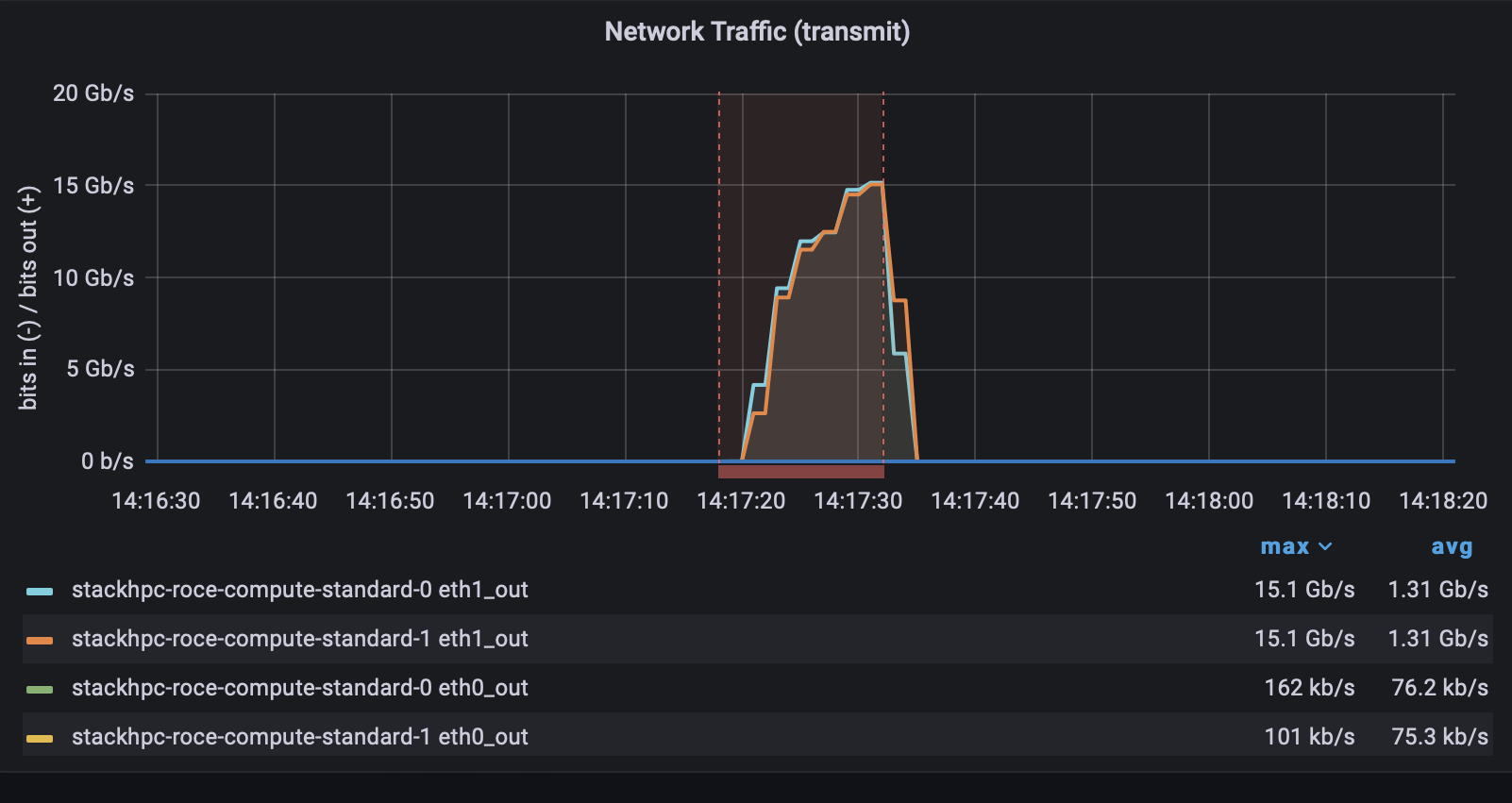 The default performance of PingPong, with a latency of ~1.6 µs indicates that Open MPI is utilising RoCE as standard. This can be further highlighted in Grafana: